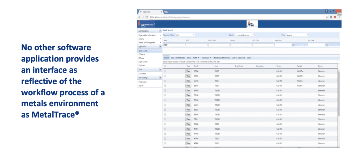 MetalTrace® is a system for managing the document management needs of metals industry clients who have industry or regulatory compliance requirements. MetalTrace® supports specific task oriented workflows and brings a best-practice solution to real operational problems. Document management functions provide for the receipt, coding, retrieval, and reproduction of quality assurance documentation. The start of the differentiation of the MetalTrace® from its traditional counterparts is first evident in the unique relational design of the database.